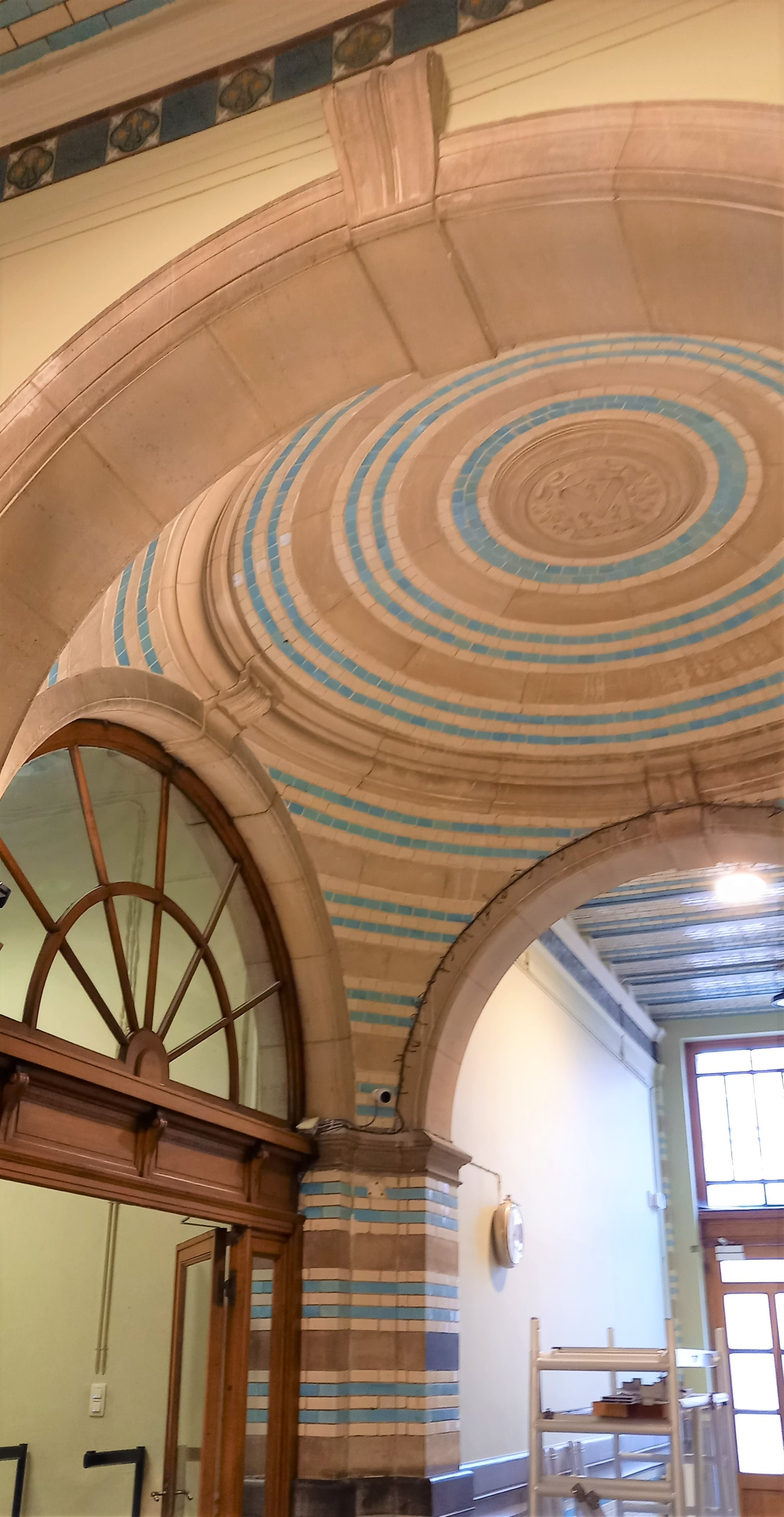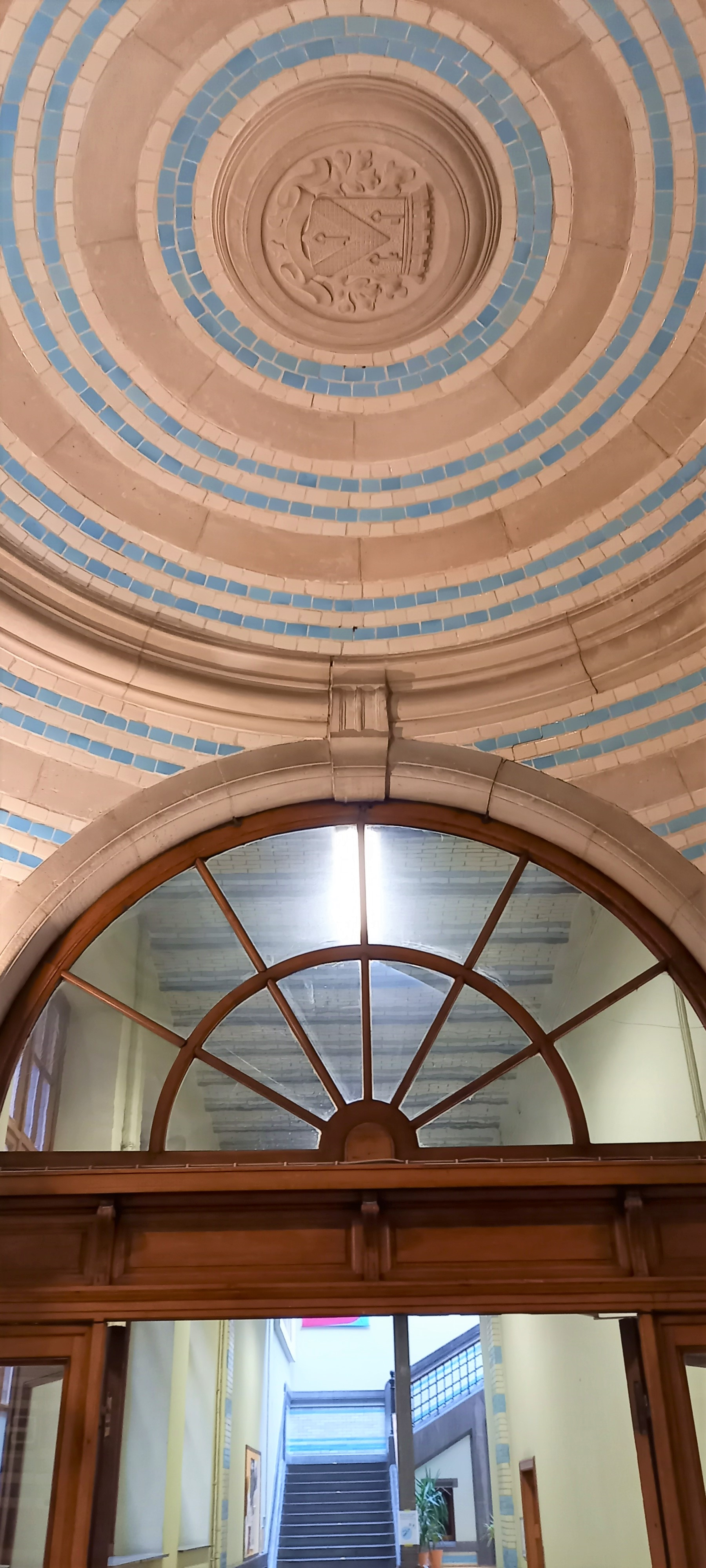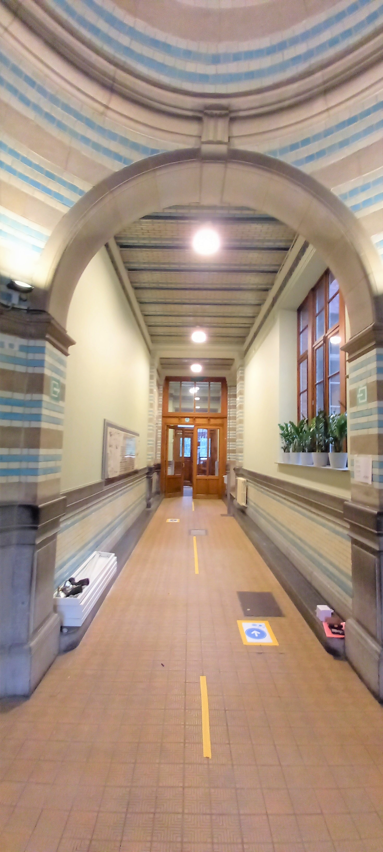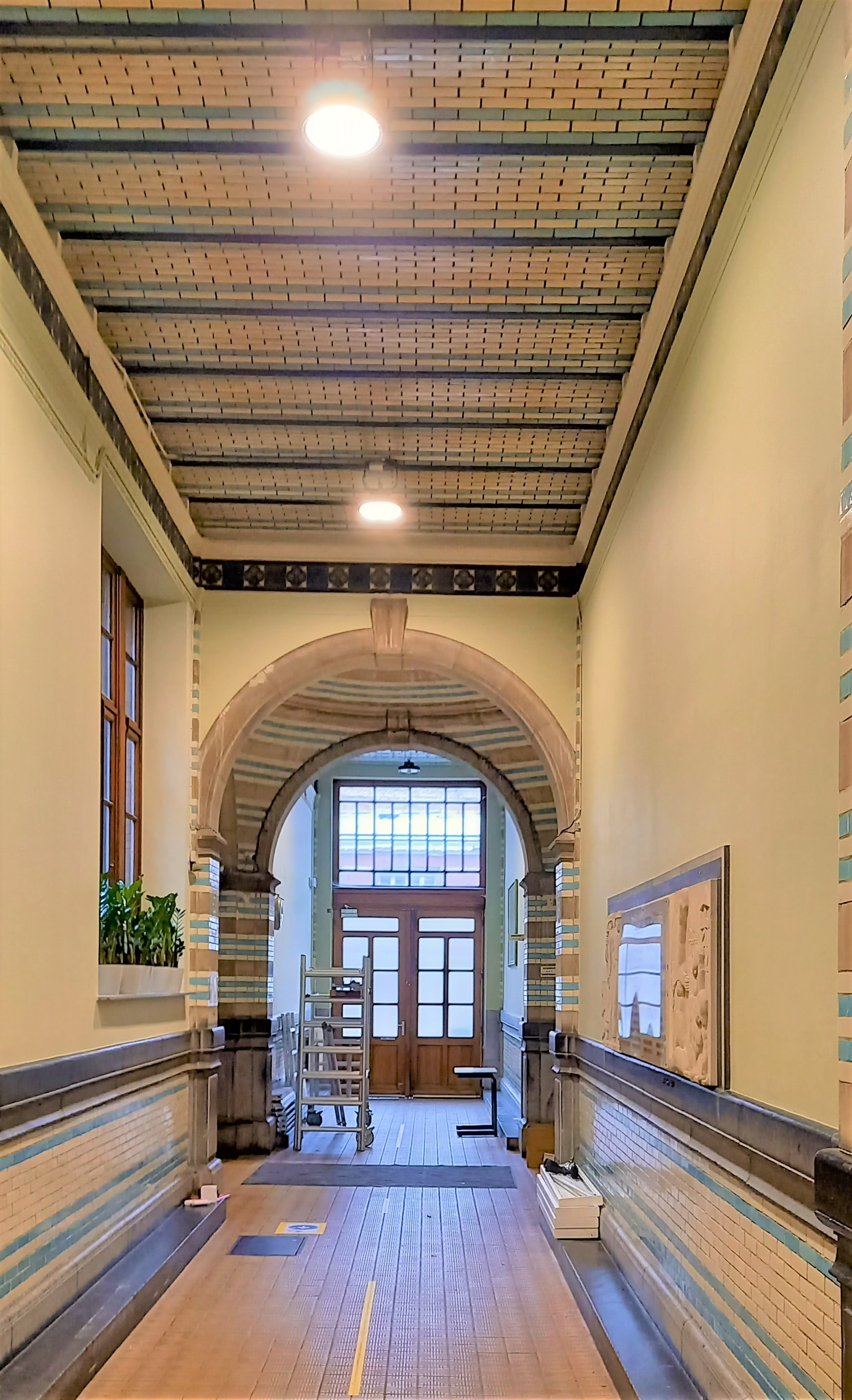 Op vraag van de schooldirectie en monumenten mogen wij een voorstel doen voor nieuwe verlichting in de historische inkom. Daar hingen oude TL-bakken met een groot verbruik die ook veel te veel aan stonden. Wij hebben gekozen voor discretere klok-armaturen waar een beweging en lichtsensoren in zitten. Deze konden we monteren op de bestaande bekabeling. Bij beweging in donkere momenten laten we alles branden op 70%. Na 10 minuten doven deze toestellen naar 30% en na nog eens 10 minuten gaat alles uit. Dit zal naar de toekomst een pak besparingen op brengen. Ook de verlichting aan de schoolpoort mochten we vernieuwen.